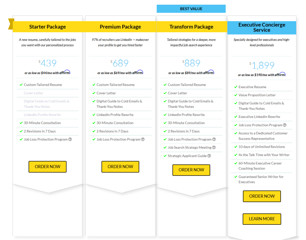 As the prices are slightly too high for entry-level job seekers, they’re probably more suited to those aiming for C-Suite positions where added customization might pay off.