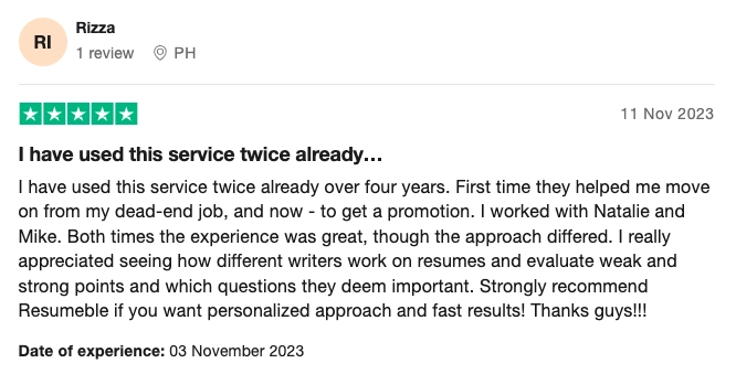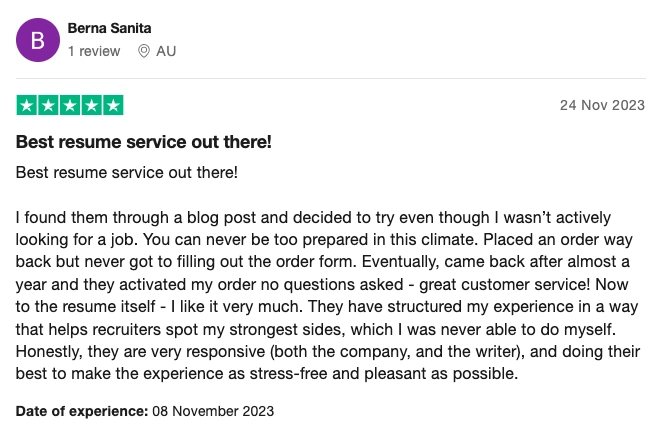 In spite of this level of personalization, Resumeble can also deliver a quality first draft in as little as 4 working days from ordering. Making them one of the fastest services, without sacrificing quality (or relying on templates or AI).