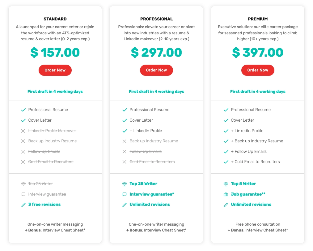 Their mid-level Professional package at $297 adds a LinkedIn profile overhaul and 60-day interview guarantee alongside unlimited revisions.